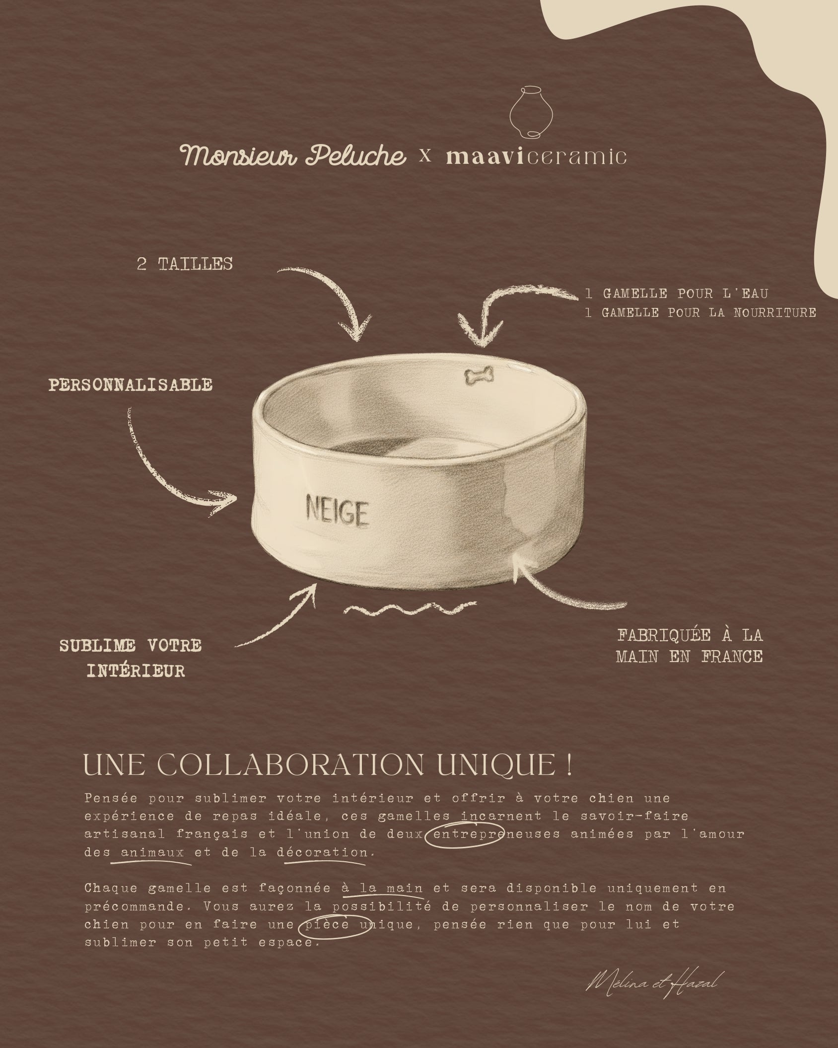 Cette gamelle a été imaginée avec passion et façonnée à la main dans le cadre d’une collaboration unique entre Monsieur Peluche & Maavi Ceramic. Chaque pièce est entièrement artisanale, ce qui la rend véritablement unique. Conçue en céramique, la gamelle peut être utilisée en toute sécurité par votre chien et se nettoie facilement au lave-vaisselle.